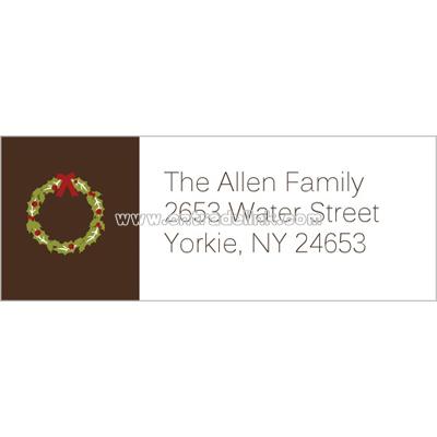 This classic holiday address label features a pretty green wreath set against a rich chocolate background. Type:Address Labels Size:2 5/8 x 1 inches photos:Text Only