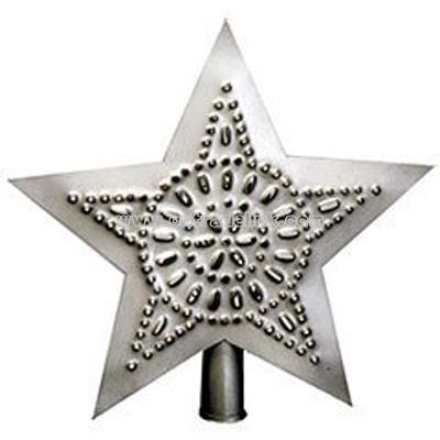 A pierced tin star for the treetop. When the light shines through the star, it makes a beautiful pattern on the wall and ceiling. Tree star measures 8 3/4" wide x 8 3/4" high. Antiqued pewter finish.