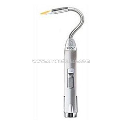 Product Description Meet the next generation of the popular outdoor utility lighter. Durable satin chrome finish makes this a great fit for the toolbox, tackle box, or camping gear stash. The flexible extended neck, topped by a lean, powerful nozzle, is slim and sinuous enough to reach even the smallest lighting apertures. The flex neck utility lighter is wind resistant, child resistant, and boasts reliable dual flame technology. Shipped filled with genuine Zippo premium butane. For optimum performance of every Flexible Neck Utility Lighter, Zippo recommends only genuine Zippo premium butane gas. · Approximately 12" length from base to neck tip · Approximately 1" wide at base