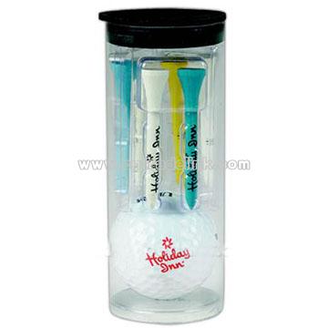 3 great balls and tees in a popular plastic tube. Includes: 3 imprinted golf balls and 6 imprinted 2-3/4" tees ? Tees have black imprint and come in assorted colors unless specified