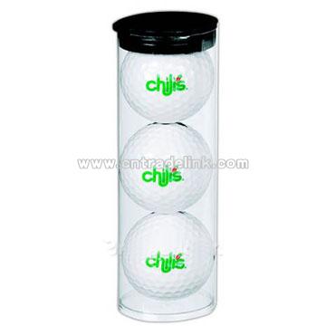 Clear tube with black cap, has three golf balls and six 2 3/4" tees. Tees have black imprint only and come in assorted colors unless specified.