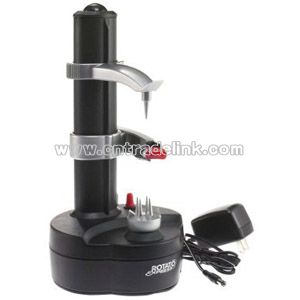 The Rotato Express is the amazing peeling machine that peels away potato, vegetable and fruit skins in just seconds in one fast, easy motion! Center the food on the bottom spikes and press gently. Lower the upper section so that it grasps the food and holds it securely. Using the height adjustment lever, raise the cutter arm so it rests on top of food to be peeled. Press the button and watch as Rotato Express quickly and neatly does the peeling for you. Rotato Express also stops automatically when the peeling is over. No waste, no effort, as easy as 1, 2, 3! Operates with a 6 V adaptor included and can also function with 4-AA batteries (not included). Built-in storage! One compartment safely stores two spare blades, while the second compartment is reserved for battery storage. Conveniently stored underneath is also a handy thumb knife to pare potato eyes or blemishes on fruits and vegetables.